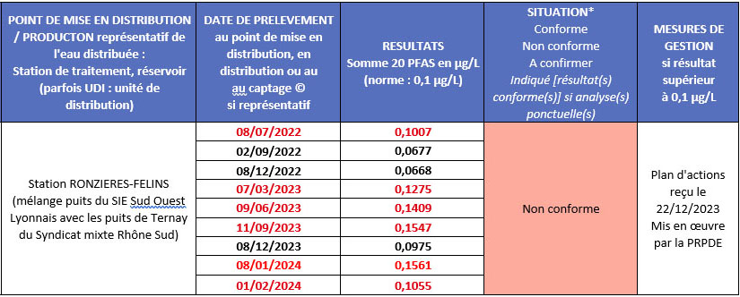 Dans ce dernier tableau, nous avons l’historique des mesures sur les PFAS depuis juillet 2022.