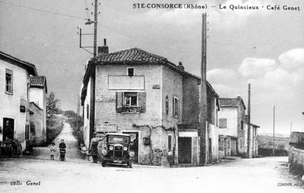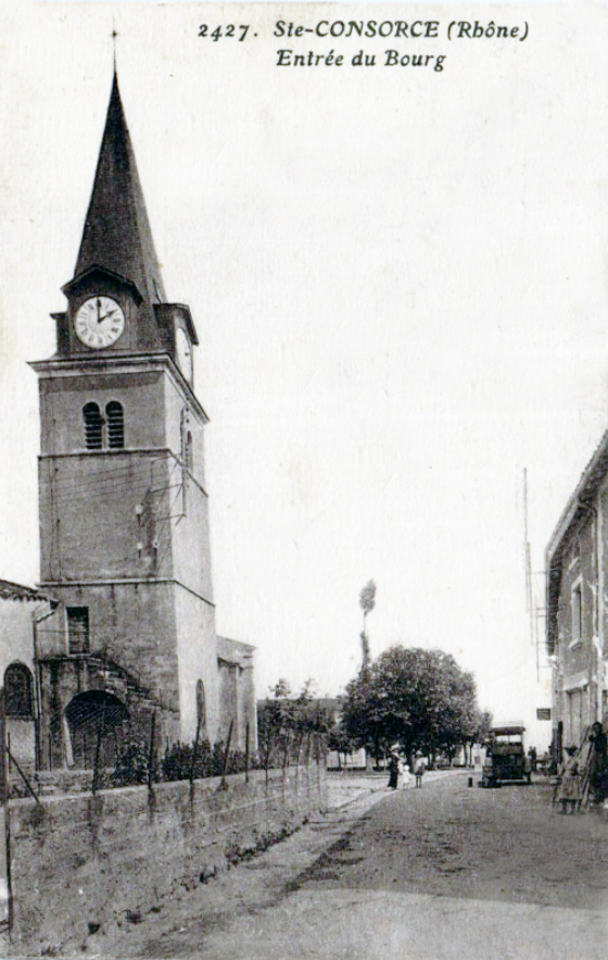 Bienvenue à Sainte-Consorce Centre-Bourg où rien n’a vraiment changé depuis le transfert du Vieux-Bourg au Centre-Bourg actuel, c’est à dire il y a 190 ans. La mairie rue de Verdun comportait à sa création les écoles, l’église a été édifiée en 1834 et s’est transformée avec l’ajout des quatre cadrans d’horloge en 1909…. L’hôtel Bouchard-Gervais puis Bouchard-Billiet ne sont plus, le restaurant « chez Annick » plus récemment non plus, mais déjà, à l’époque, une terrasse aménagée sur la rue ou sur la place paraissait une évidence afin d’animer quelque peu le nouveau Centre. Un hôtel, un bureau de tabac, un restaurant, une boulangerie étaient présentes au XIXème siècle.